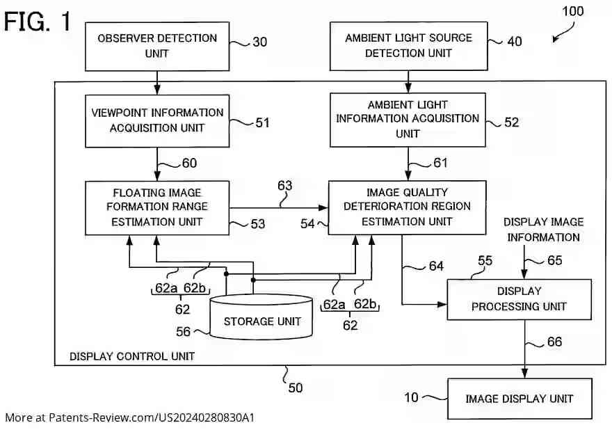 One significant issue with existing floating image displays is that image quality can deteriorate due to ambient light interference. When external light sources reflect off the optical system, they can obscure or distort the floating image, making it difficult for observers to see clearly. This invention aims to adapt the displayed image not only to the viewer's eye position but also to the lighting conditions around the device, enhancing overall visibility.